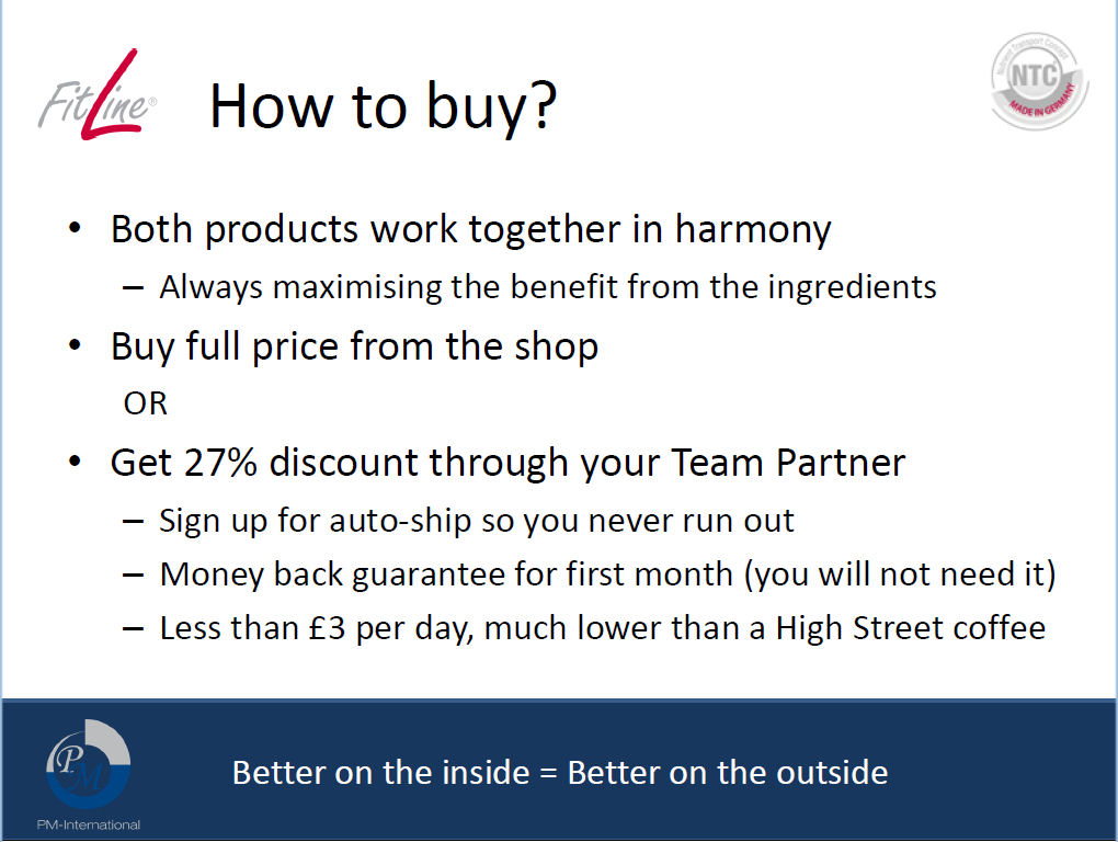 FitLine nutrient rich wellness drinks are Great Value at less than £1.50 per drink based on the Optimal Set (Morning drink Power Cocktail & Night time drink Restorate) autoship prices. So confident are PM about their products they offer a satisfaction guarantee. Sign up for the autoship, If you are not happy with the first month of drinks, you can return the other 2 months and the empty box within 30 days of purchase, and get a refund. So why not give it a try. You’ve nothing to lose, worst case scenario, it’s a nice couple of healthy drinks a day for a month free of charge, but we are confident as we found from our personal experience you will love the drinks, and feel the benefits of them.